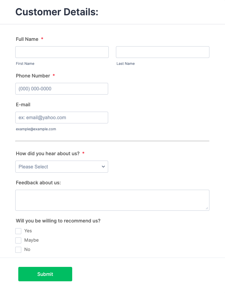 - A prebuilt referral form that allows customers to provide contact information for their friends and family and a referral program form to collect additional information that might be important to your outreach