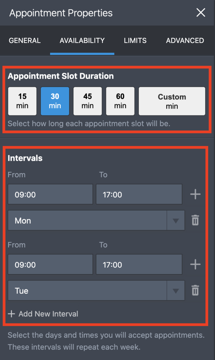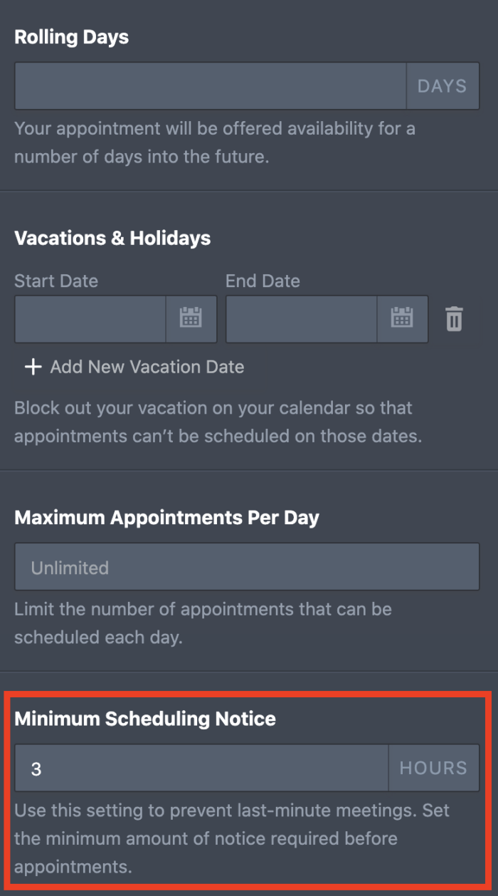 The appointment field can limit the number of meetings on any day, prevent students from scheduling a meeting on short notice, and black out dates and times to prevent scheduling conflicts.