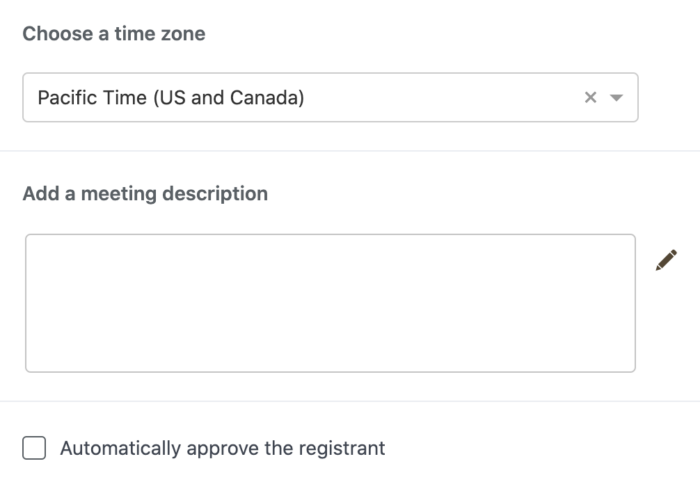 Apart from setting newly created meetings to specific time zones, the Zoom integration can also approve and schedule meetings automatically, or you can manually approve requested meetings in Zoom.