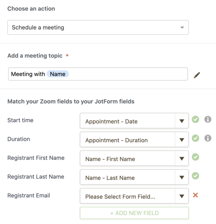 Jotform’s Zoom integration allows you to create new meetings or add students to existing meetings as soon as they fill out an online appointment form. Along with the date, time, and duration of a meeting, the integration uses submitted form information to fill in other important details, such as a student’s name and email address.