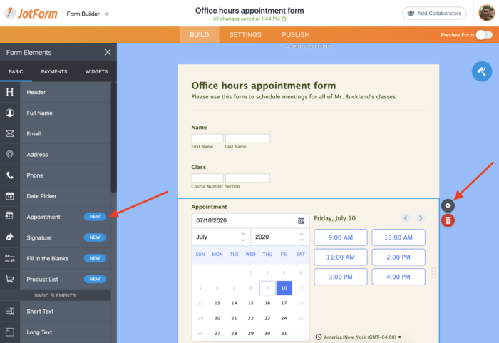 You can use Jotform’s appointment field, which provides customizable options for students to book a virtual meeting with you. This feature integrates with Google Calendar, so it will automatically sync to make it easy to keep track of your upcoming appointment schedule.