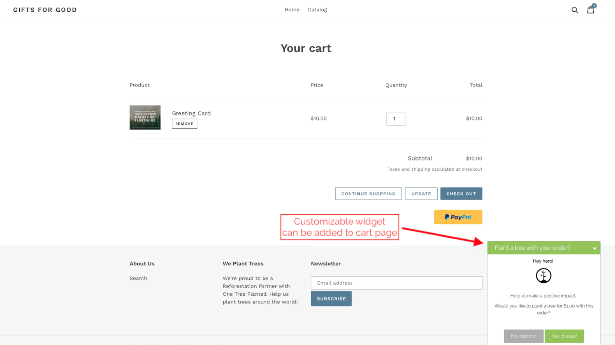 Ecologi lets you set the conditions for how your business will donate (e.g. for every order received, for each dollar spent, etc.), which will be displayed to customers in a message at checkout (e.g. “We plant a tree for every order received”). The app is free to install.