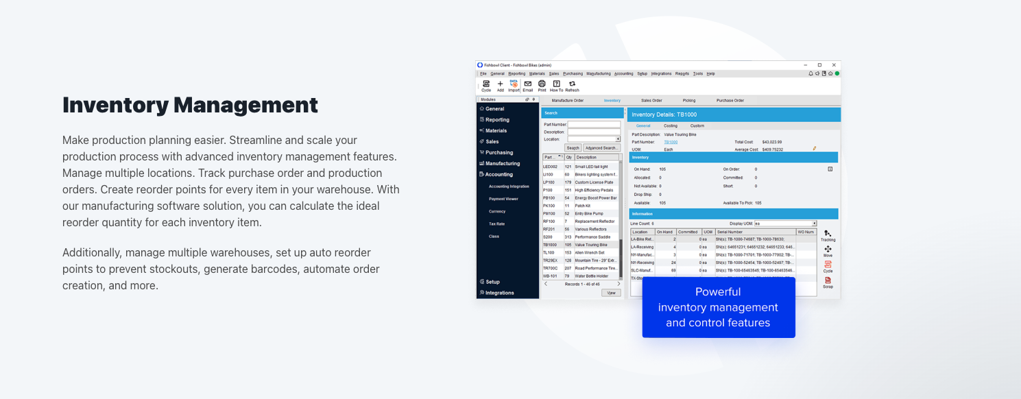 With Fishbowl, you can automate your inventory and order management to save time and money while allowing for more detailed tracking. Ideal for both manufacturers and warehouses, Fishbowl lets you track inventory with details such as serial and lot numbers and expiration dates. You can use work orders, bills of materials, production stages, and more to organize your jobs, while barcode scanners make for accurate batch picks.