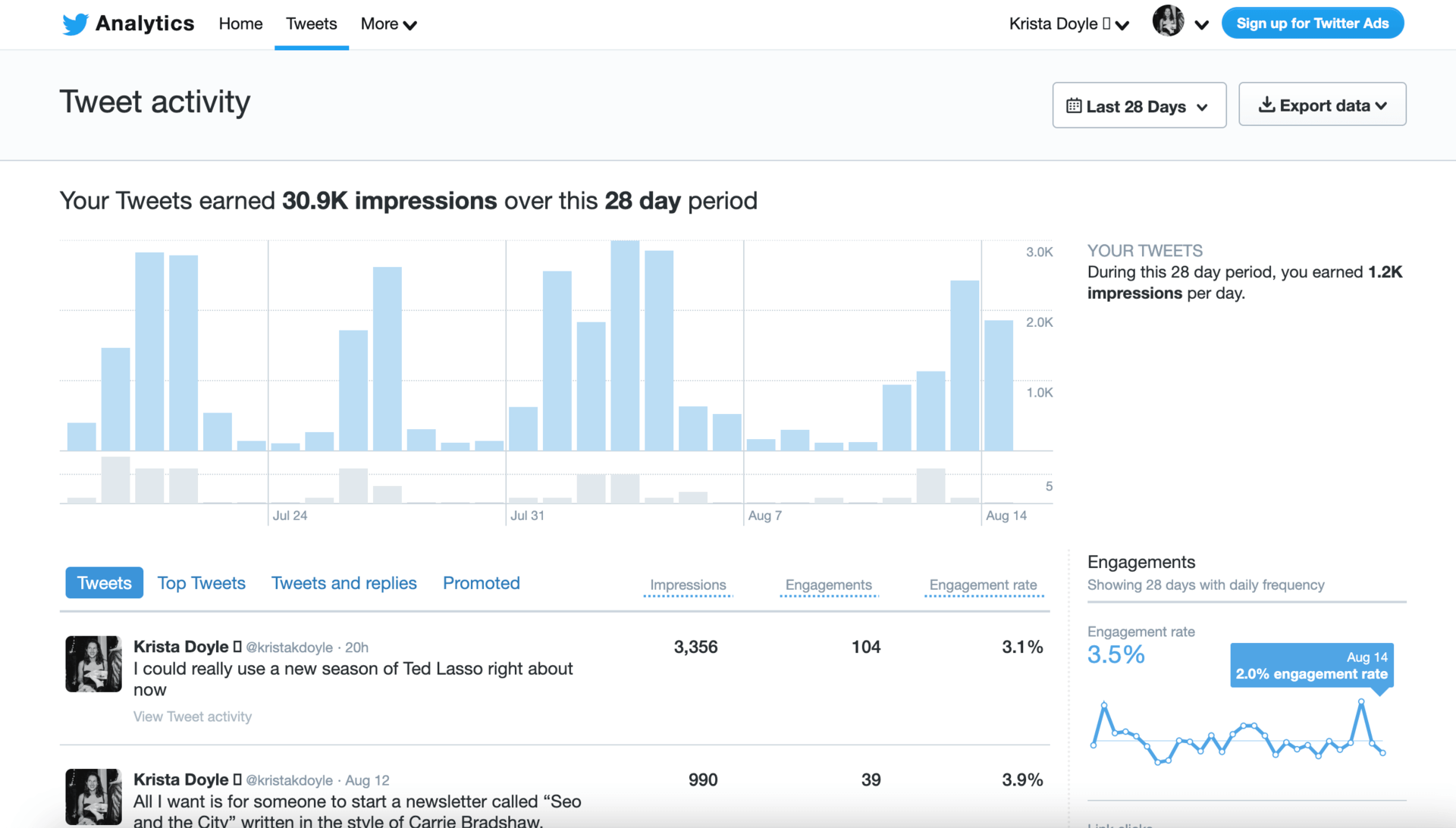 Twitter Analytics features three different sections. The account home, Tweet Activity Dashboard (TAD), and campaign dashboard allow you to track information on engagements and impressions, your top Tweets, and your Twitter ad performance.