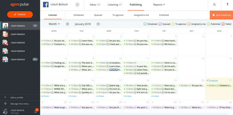 Agorapulse integrates with Facebook, Twitter, LinkedIn, Instagram, and YouTube. You can schedule individual posts or publish your posts across all platforms at once.