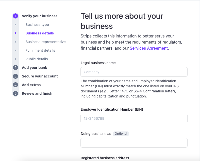 - Input your nonprofit’s legal information, including your employer identification number (EIN) or tax identification number. Stripe also encourages users to enable multiple methods of two-step authentication to keep their accounts secure.