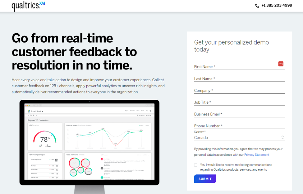 Qualtrics is a robust enterprise-level tool with leading data analysis techniques. You can use it to conduct customer feedback surveys in different channels — such as your website, email, or SMS — and use predictive analysis, sentiment analysis, and other techniques to understand insights from survey responses. Plus, it keeps a detailed record of every customer interaction. Qualtrics also helps identify key issues your customers face in real time.