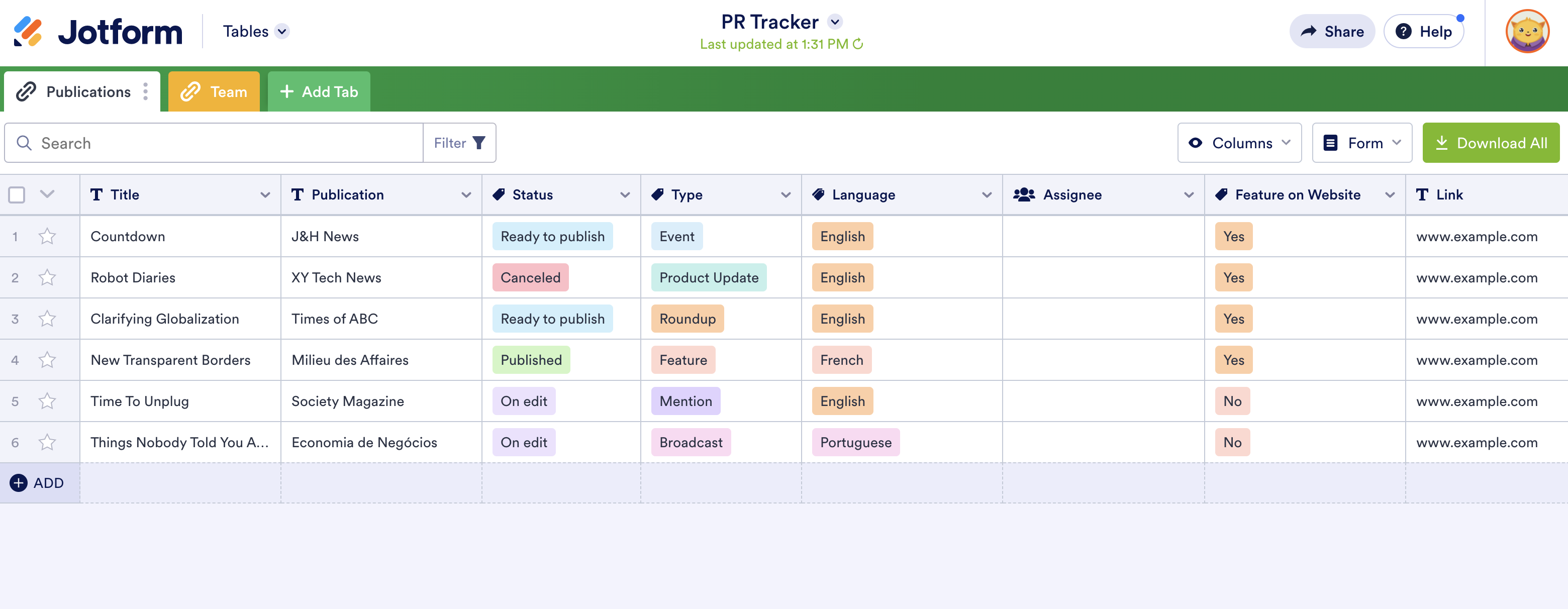 This template includes columns for all of your key PR information. You can look at your data either in a table or switch to a calendar view to help you keep track of key upcoming dates. Give our PR tracker template a try today, and streamline your PR operations.