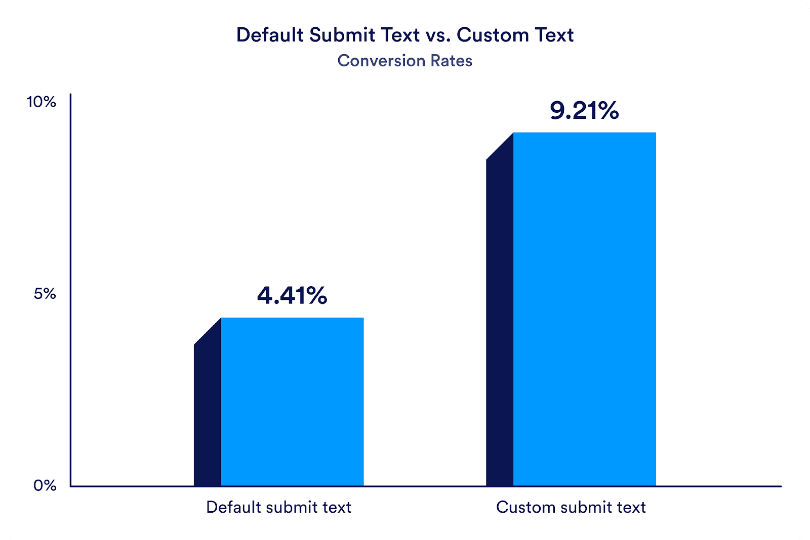 Among Jotform forms that are used to collect leads, those with default “Submit” text convert at a rate of 4.41 percent on average, while the conversion rate more than doubles on lead forms using custom CTA text.