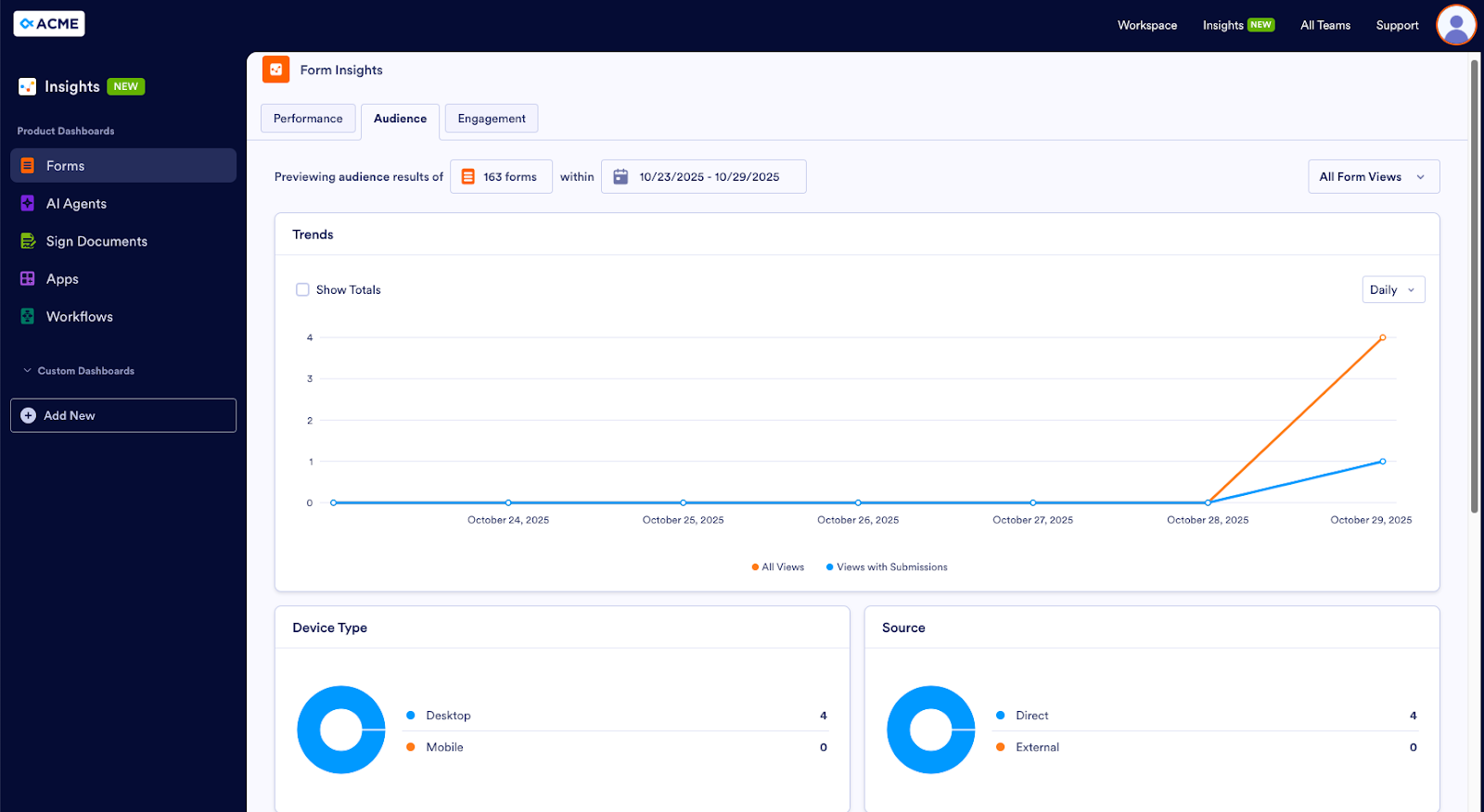 Insights gives you access to more data points in more detail and for a wider variety of digital assets. Unlike the previous analytics functionality, Insights includes metrics for Jotform Apps, Sign documents, Workflows, and AI Agents as well as forms. Plus, you can use filters to adjust the displayed data and even build custom dashboards.