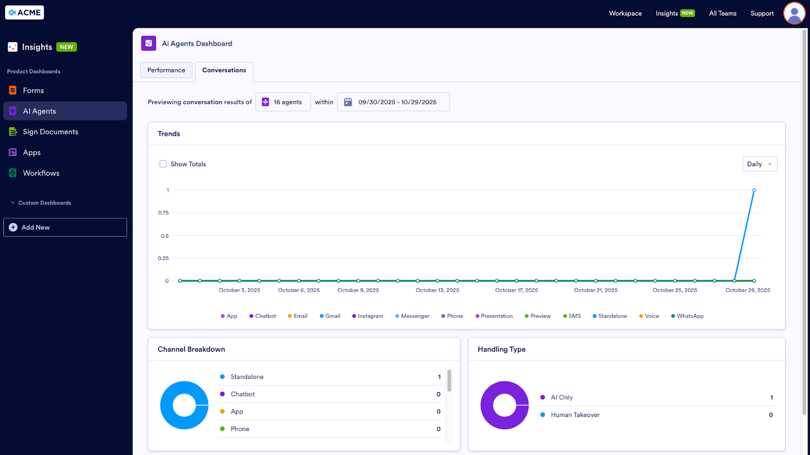 With Insights, you have the ability to monitor AI agent conversations and workflows to assess their efficiency. This helps organizations reduce manual work and automate more tasks, while maintaining quality.