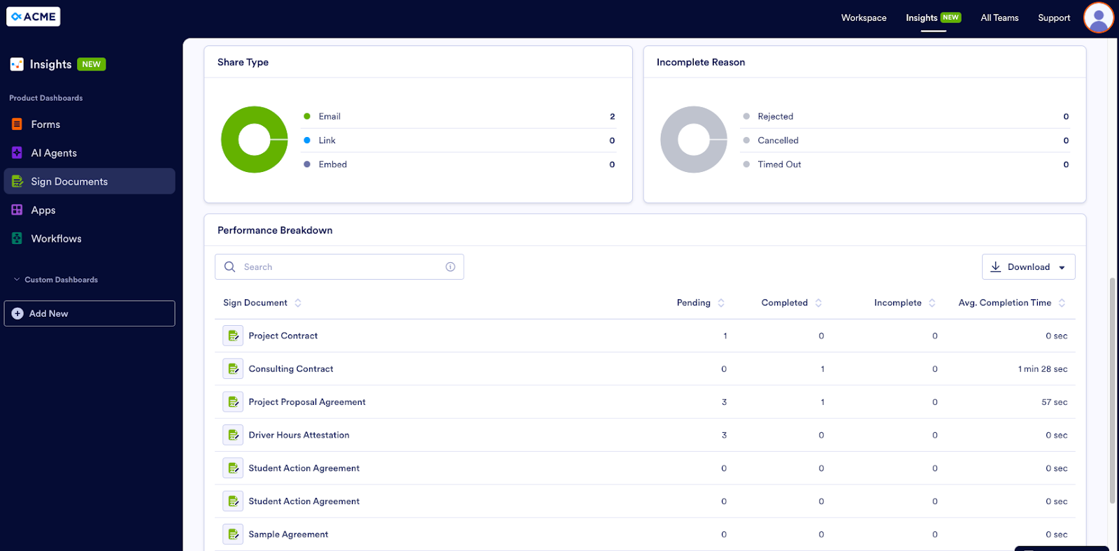 - Spot underperforming forms, documents, AI Agents, apps, or workflows and optimize them