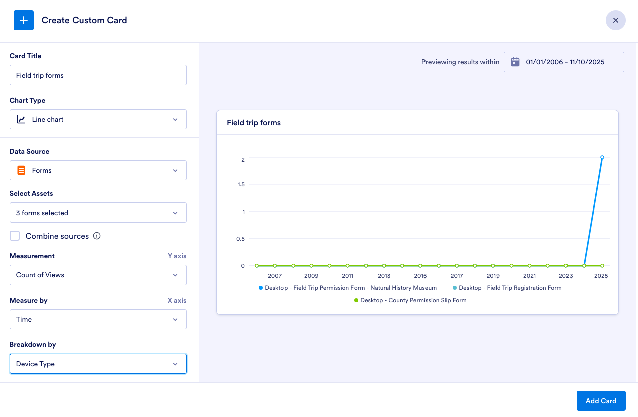 Then he makes selections for a range of items, like Chart Type, Data Source, and assets. He selects his field trip forms and indicates that he wants to see the number of form views per year, with a breakdown by device type.