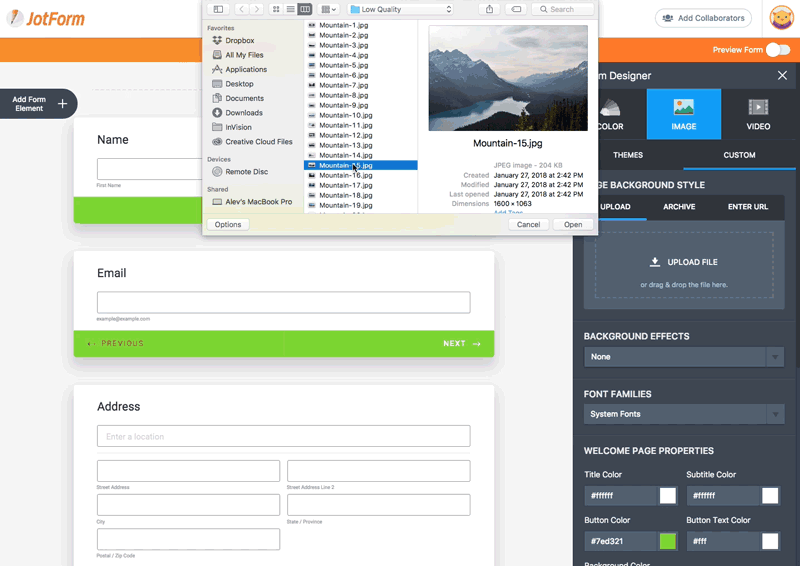 The form’s background, buttons and progress bar styles change automatically when you add in your logo. Jotform Cards also re-arranges the color scheme to make sure everything matches beautifully. You can test out this feature in Jotform’s Form Builder. Just add your logo to your welcome page, sit back and watch the magic happen…