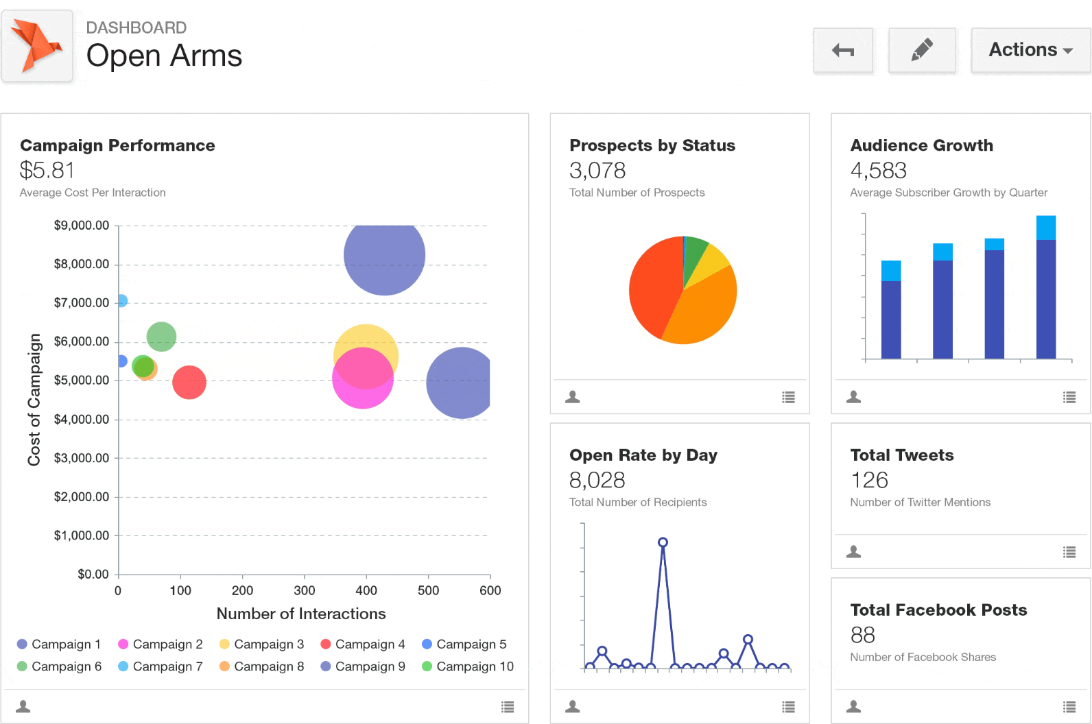 The platform prioritizes marketing automation through prebuilt online form and email templates; drag-and-drop functionality; and shareable, measurable ad campaign dashboards and reports. Most importantly, Insightly reinforces a stellar customer service experience by allowing you to scan and analyze customer support ticket times, keywords, and phrases to see if and how you’re meeting your customers’ needs.