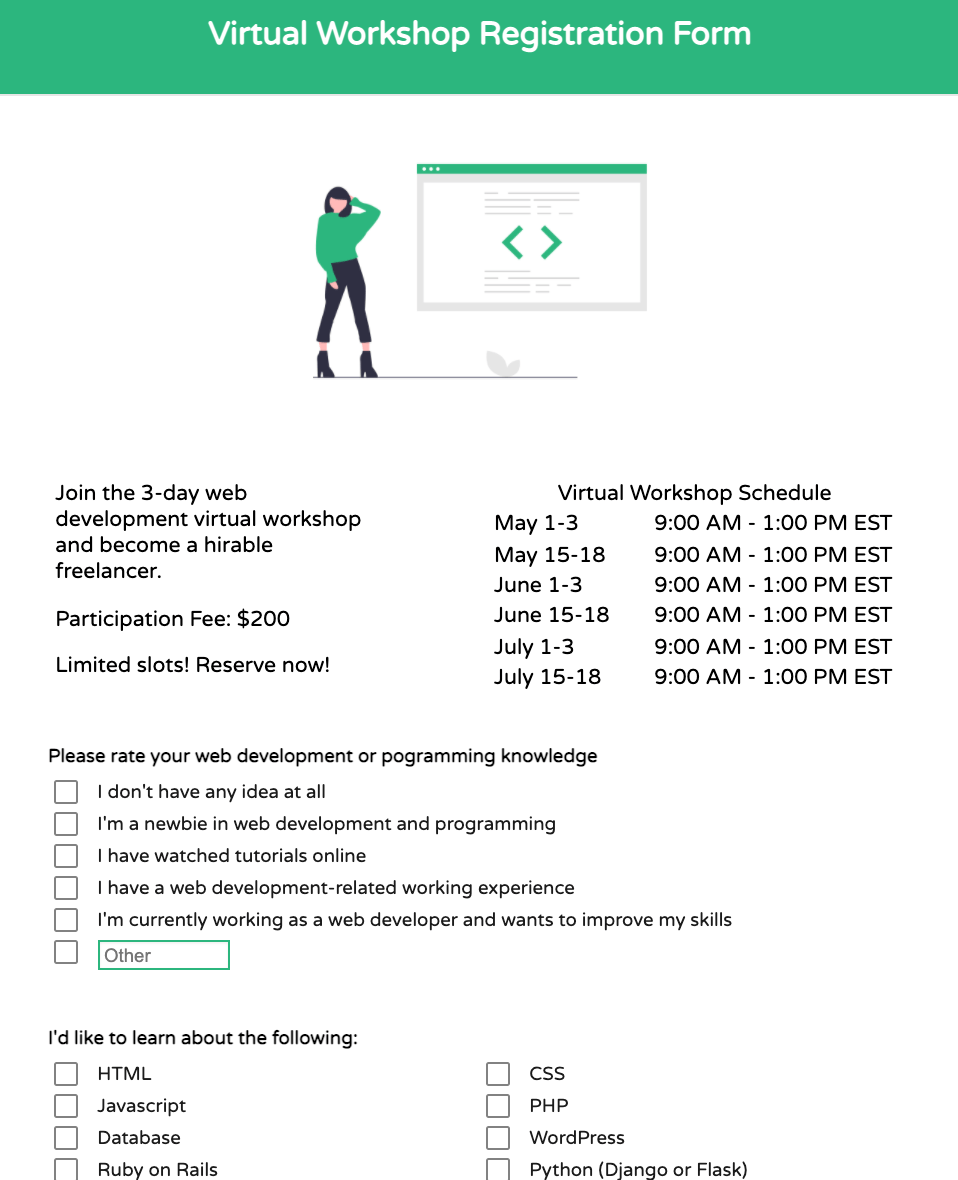 So you’ve chosen your virtual event platform, and now it’s time to get started. Jotform is a great tool for collecting registrations or exhibitor applications. Just choose from hundreds of premade virtual event form templates.