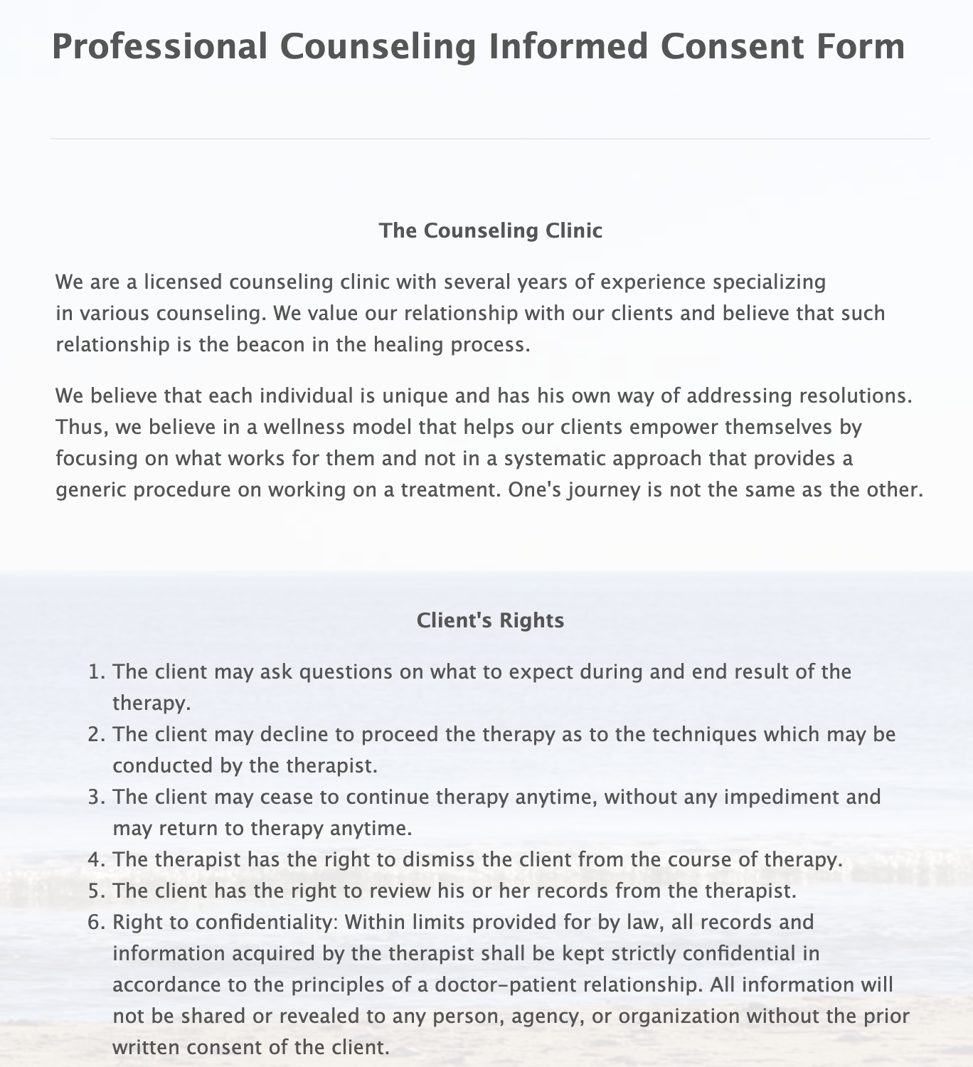 Informed consent in relation to counseling doesn’t really differ from informed consent for any other medical treatment you may receive. According to the code of ethics for the American Counseling Association (ACA), “Counselors have an obligation to review in writing and verbally with clients the rights and responsibilities of both counselors and clients.”