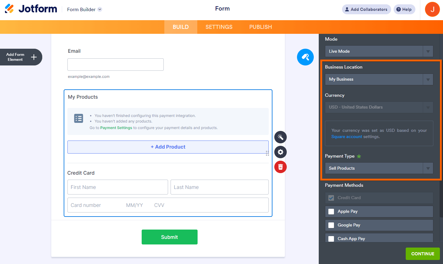 To connect to the Square integration, head to the Jotform Form Builder and follow these steps: