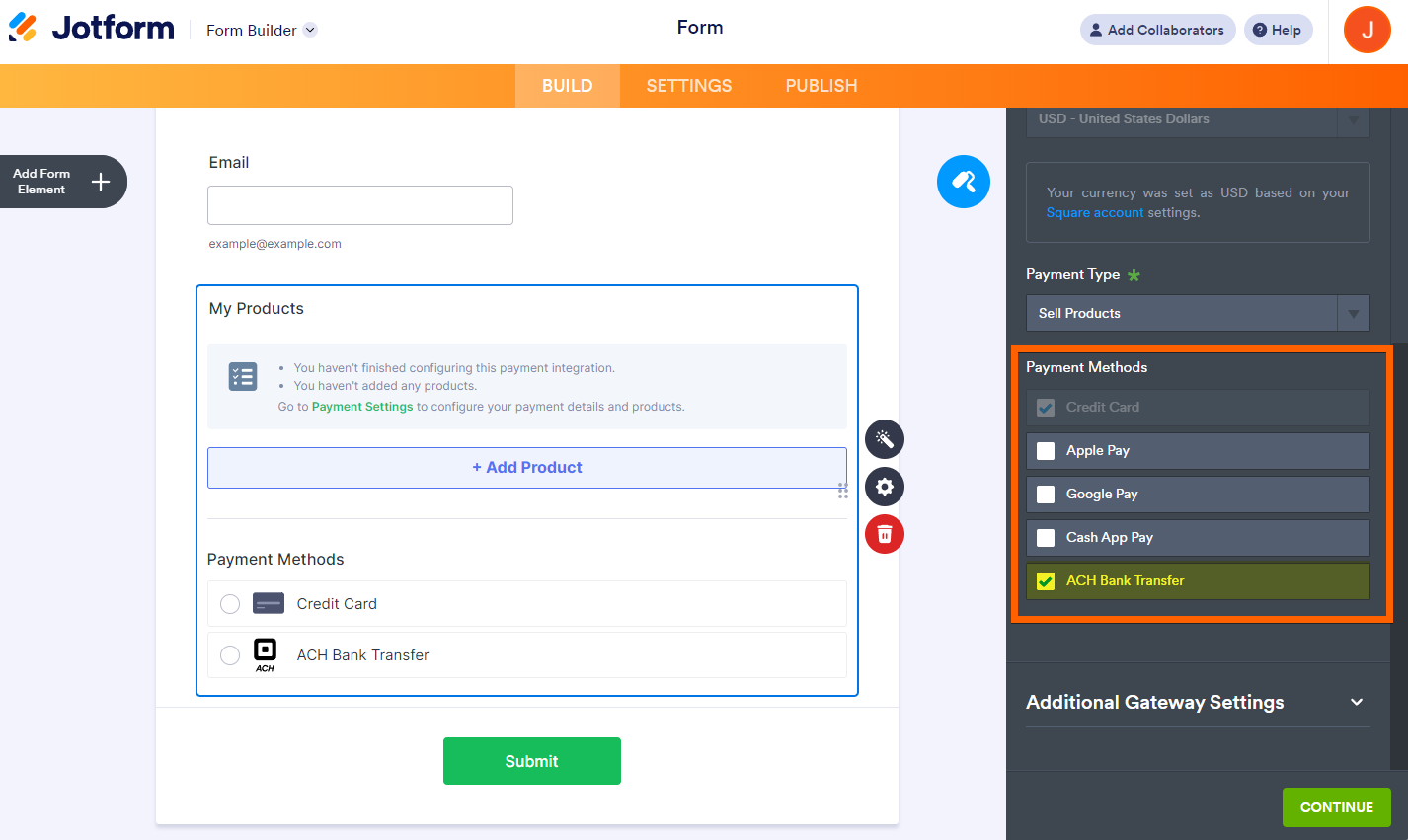 If you’re looking for an easy way to set up ACH payments in Jotform, you can use Jotform’s integrations with Square and Stripe. You can add more payment methods through direct banking and start bringing in customer payments in just a few easy steps.