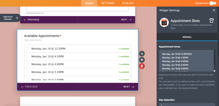 The widget also displays the number of slots available for a specific time and reduces that count as people submit their forms.