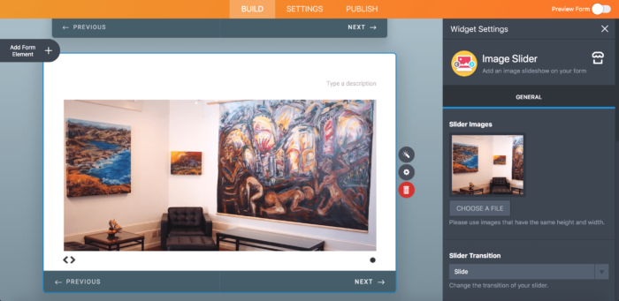 The Image Slider widget allows you to not only place a photo gallery in your form but also to control how your images are displayed. After adding the widget and uploading your photos, you can set your image transition preferences and determine how long each image is displayed.