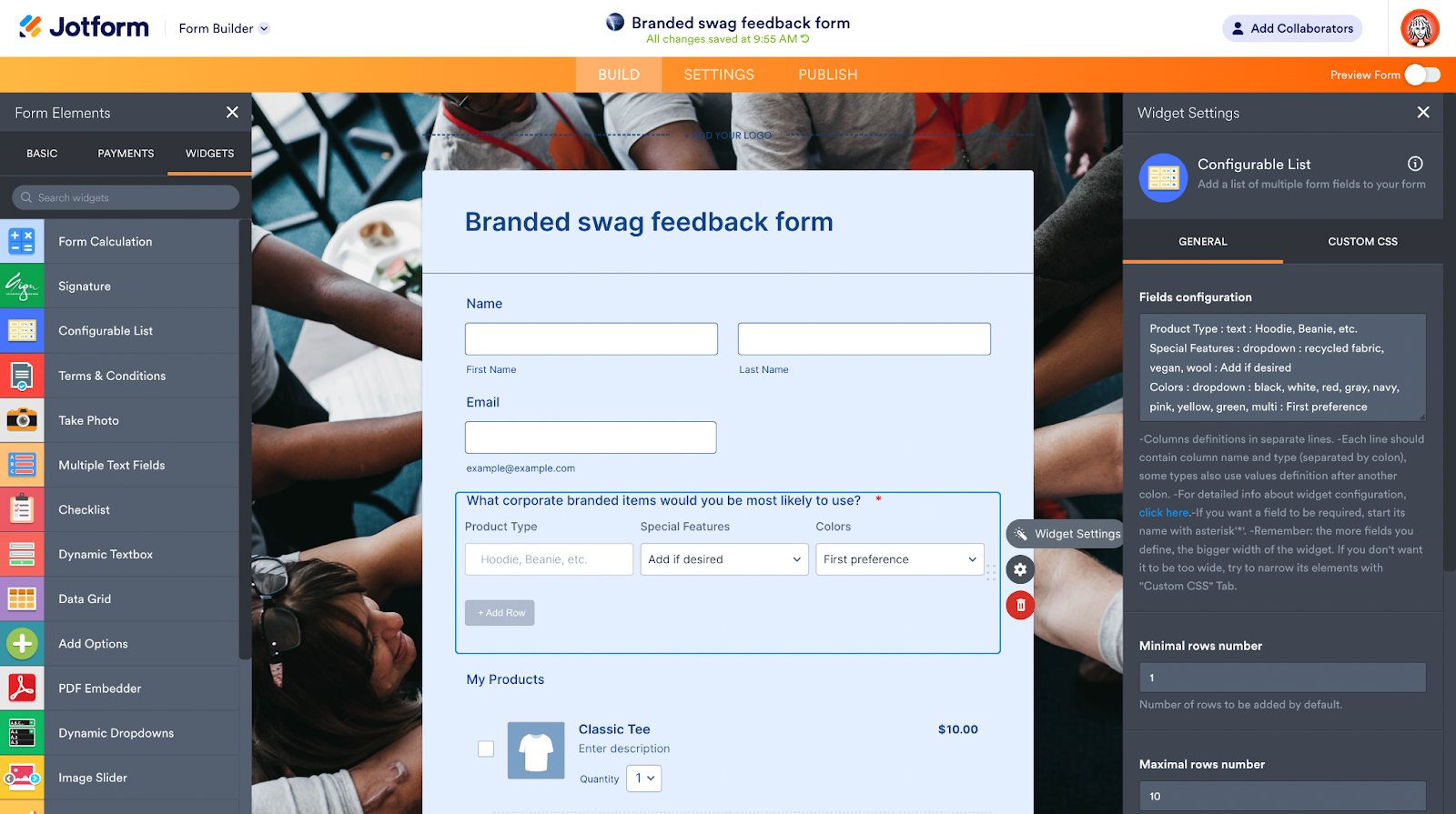 As the name implies, you can configure the Configurable List widget to accommodate different types of field inputs, customizable labels, and any number of columns and rows. In a few clicks, you can tailor the list for numerical data, dropdown options, radio buttons, dates, and times, as well as static messages to instruct or inform.