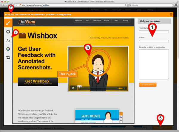Wishbox is useful for getting feedback from your web site visitors. Let's say you have just released a new design for your web site, and you want to find out what people think about it. You can simply copy and paste the Wishbox code to your web site and every page on your site will have a "Send Feedback" button on the side. Then you can get people to send their feedback, and if they have any suggestions or problems, let them draw them on a screenshot of the page.