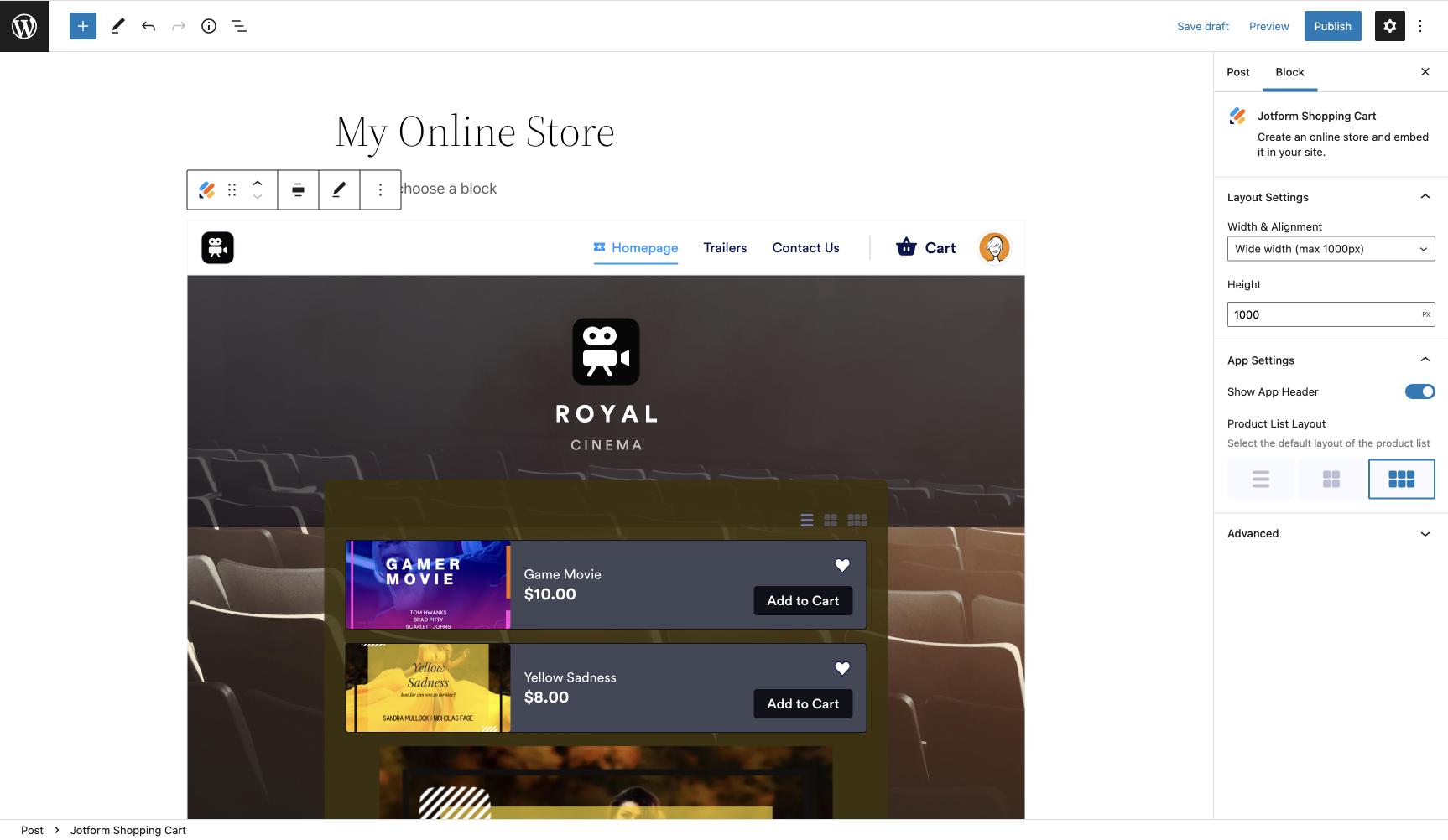 Once your store is ready, you can use the Jotform Shopping Cart plug-in to add your store to your WordPress website. This plug-in is easy to use, fully customizable, and completely code free.