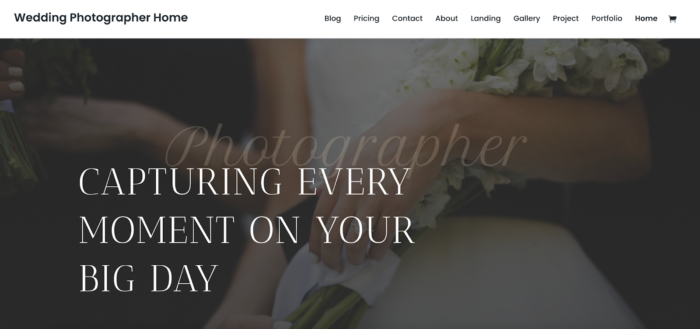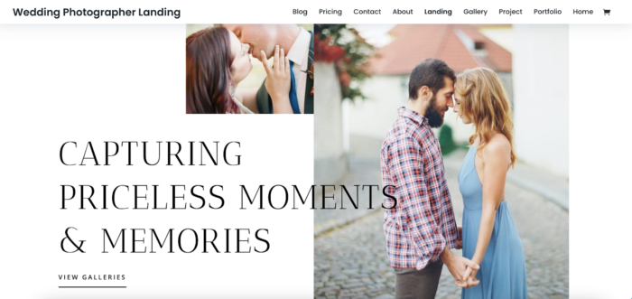 This demo site example focuses on wedding photography and includes a variety of page layouts for blogs, pricing pages, project pages, and more.