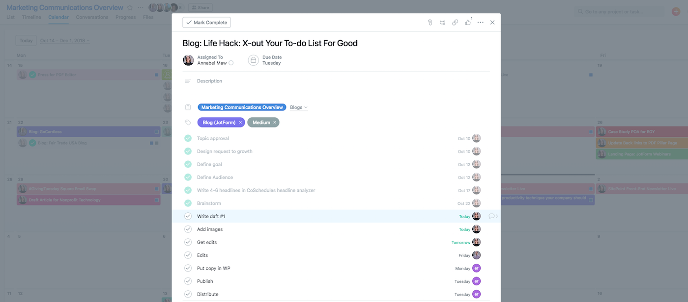 Another awesome perk is that we can assign different people and deadlines to different parts of the project and check in on how they’re going. We also have access to both a list and calendar view. The list view resembles a to-do list because you have the ability to mark a finished task as “done.” You get the satisfaction of checking something off but can also see the big picture of your task at large. Among other productivity tools, it’s become an integral part of our workflow.