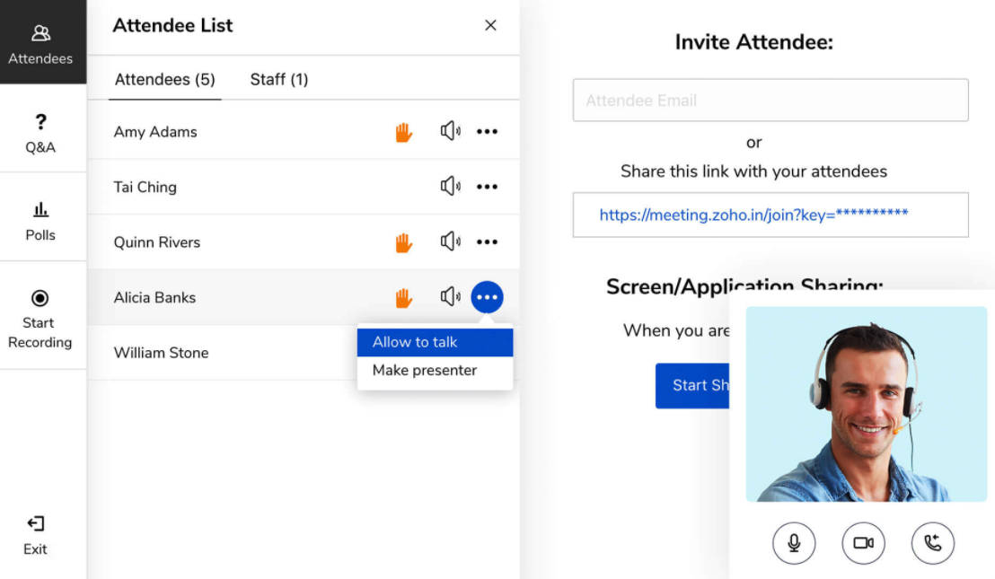 If all you need is something to hold meetings, without webinar features, Zoho Meeting might be a good option. It lets you share screens, mute participants, and record group chats. You can embed meeting links on your website and send email reminders.