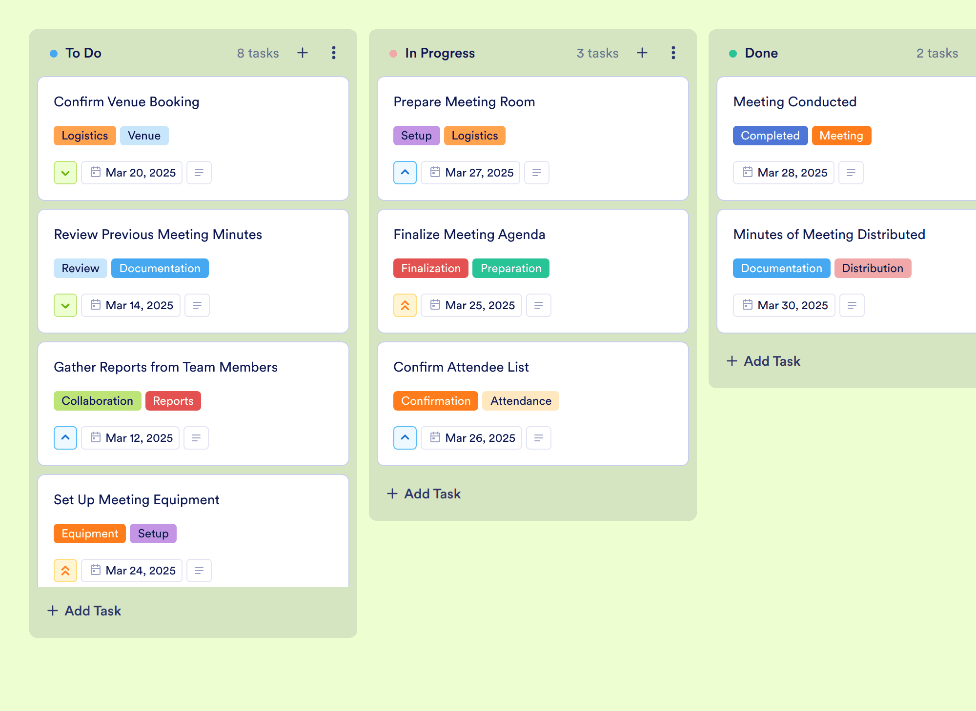 Jotform Boards enhances your online task management experience, allowing you to connect forms to your board and automate the creation of tasks based on submissions. With a user-friendly drag-and-drop interface, you can easily organize tasks across various stages, assign responsibilities, and communicate within the team through comments. This digital collaboration tool promotes efficient workflow automation, helping you streamline your meeting preparations and follow-ups, ensuring nothing falls through the cracks.