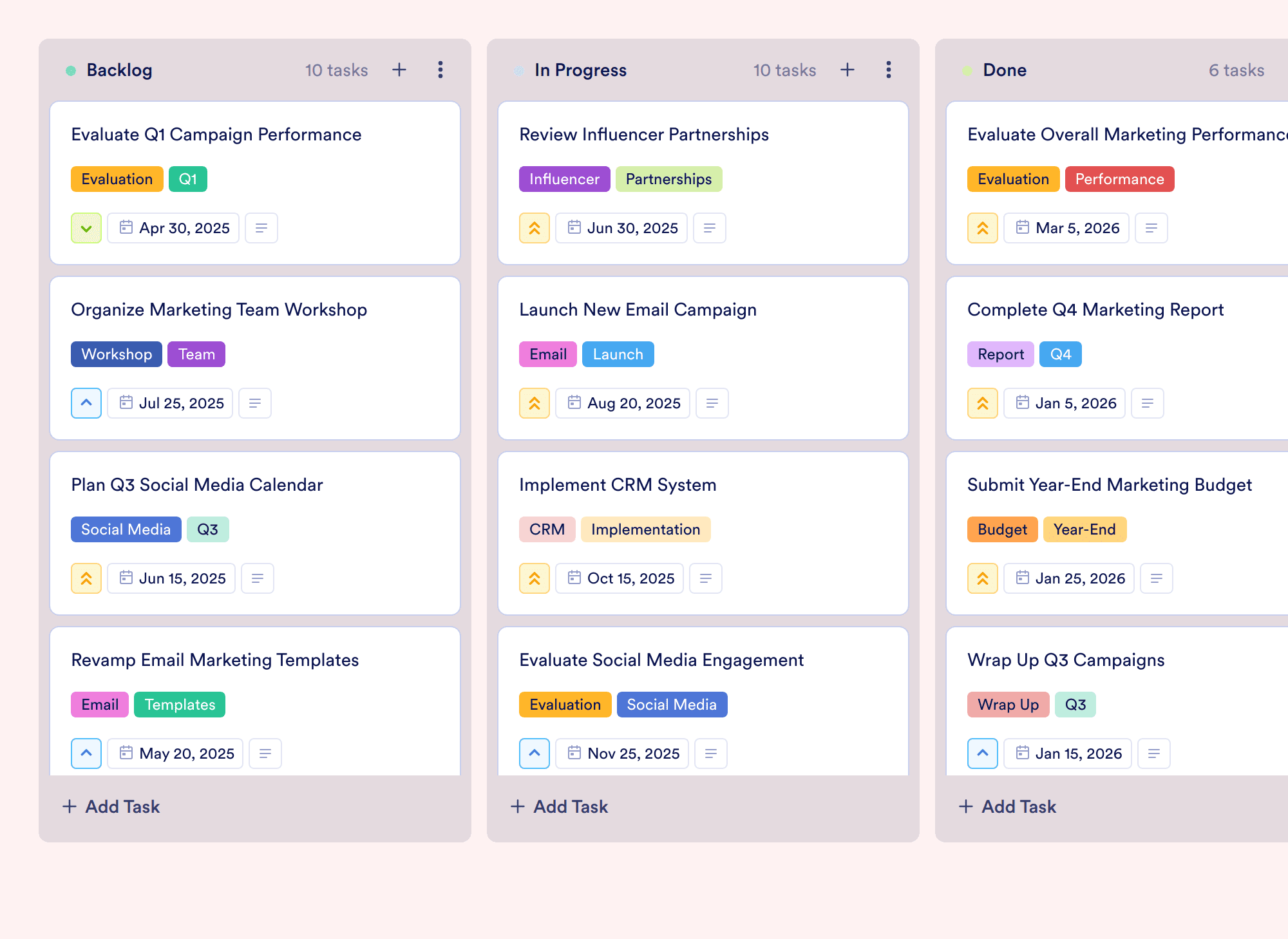 You can monitor the status of each marketing task using the Kanban board layout. Move tasks between different stages, such as "Backlog," "In Progress," and "Done," to visually track progress.