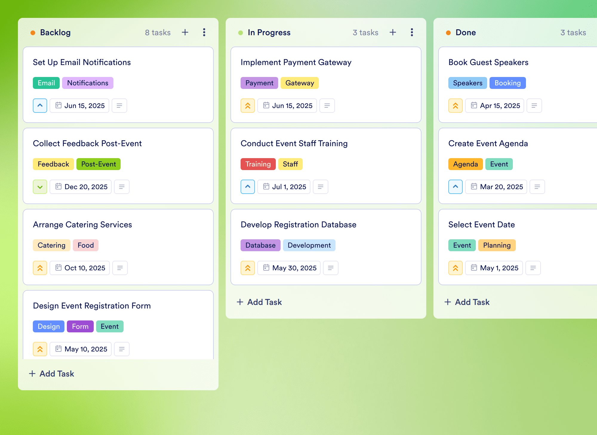 The Music Festival Planning Template is an essential board template designed for event organizers and teams planning music festivals. This template allows users to manage all aspects of festival planning, from designing the event registration form to arranging catering services and booking guest speakers. Ideal for event coordinators, marketing teams, and logistics personnel, this customizable board ensures that every detail is accounted for, helping you stay organized and on track.