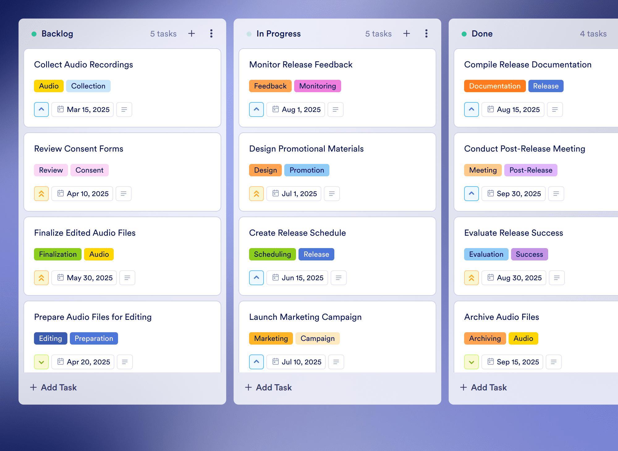 The template should include tasks such as collecting audio recordings, reviewing consent forms, preparing audio files, scheduling editing sessions, and launching marketing campaigns, along with deadlines and priority levels.