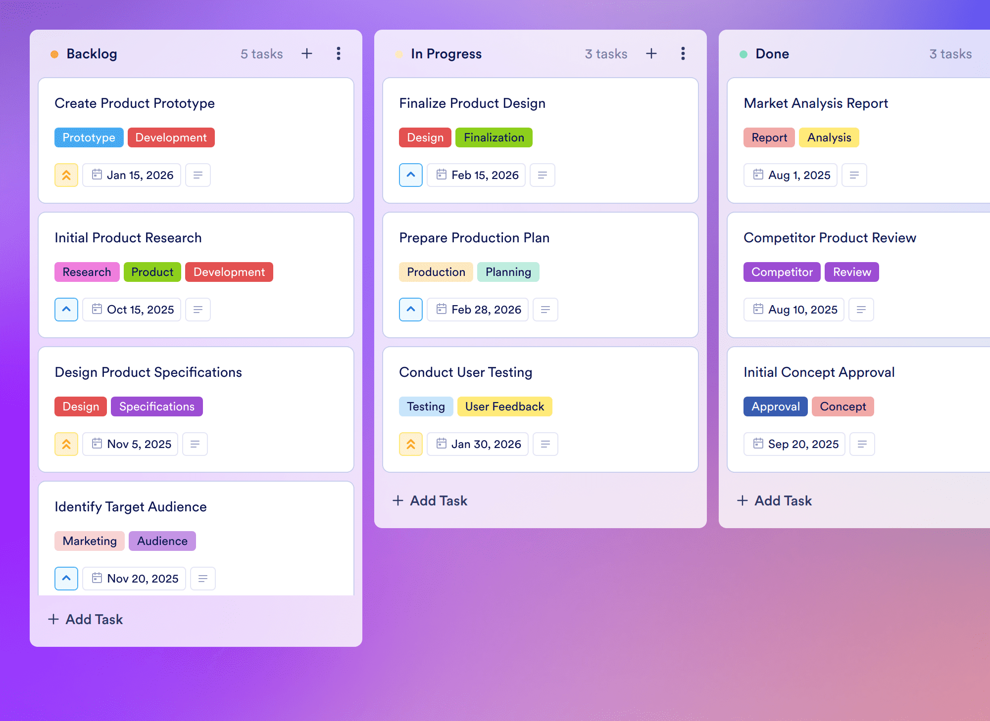 The Product Launch Calendar Template is an essential board template designed for marketing teams and product managers coordinating product launches. This template helps streamline the entire launch process, from conducting initial research to executing the launch event. With clearly defined tasks such as designing product specifications, developing marketing strategies, and conducting user testing, teams can ensure that every aspect of the product launch is meticulously planned and executed.