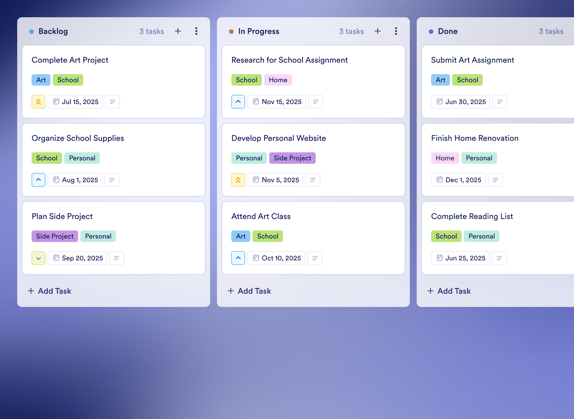 The Productivity Log Template is an essential board template designed for freelancers, students, and professionals looking to enhance their productivity and task management. This template allows users to track various personal and project-related tasks, making it ideal for anyone juggling multiple responsibilities. Whether you are completing an art project, organizing school supplies, or planning a side project, this customizable board helps you visualize your progress and prioritize tasks efficiently.