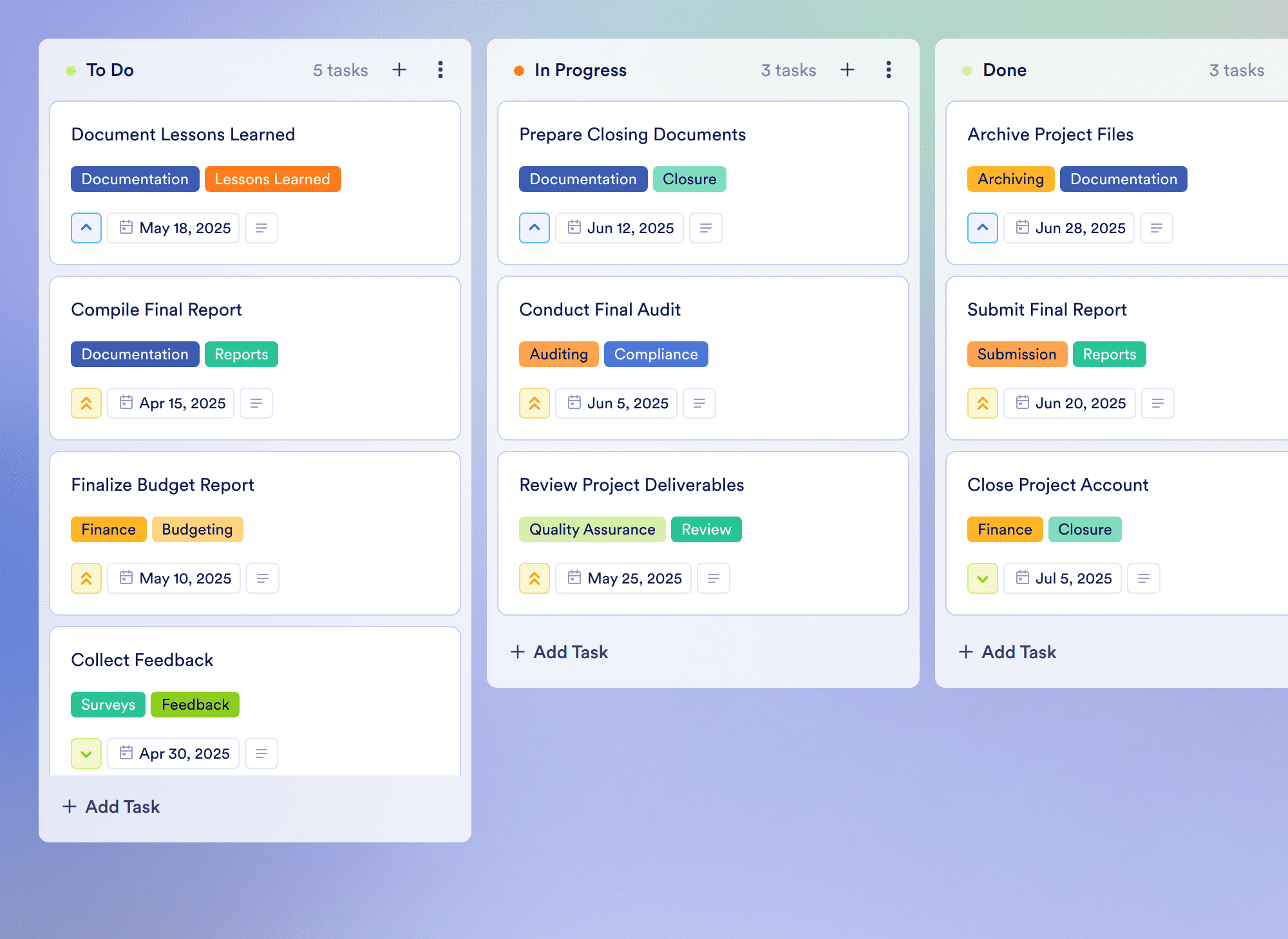 Utilizing Jotform Boards, this board template enhances your online task management experience by allowing you to track tasks visually on a Kanban board. You can customize your board to fit your project's unique needs, set priorities, and assign tasks to team members. The drag-and-drop interface makes it easy to move tasks through different stages, while collaboration features like comments and activity logs ensure seamless communication among team members. With the workflow automation capabilities of Jotform Boards, your team can focus on delivering a successful project closure.