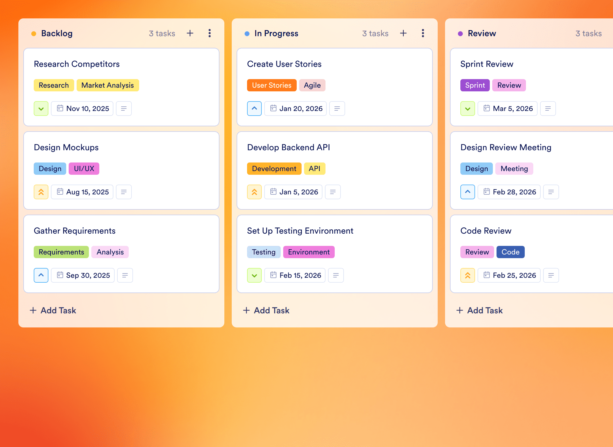 The template should include task titles, descriptions, due dates, priority levels, and assigned team members. It should also reflect the different stages of the project, such as backlog, in progress, review, and completed.