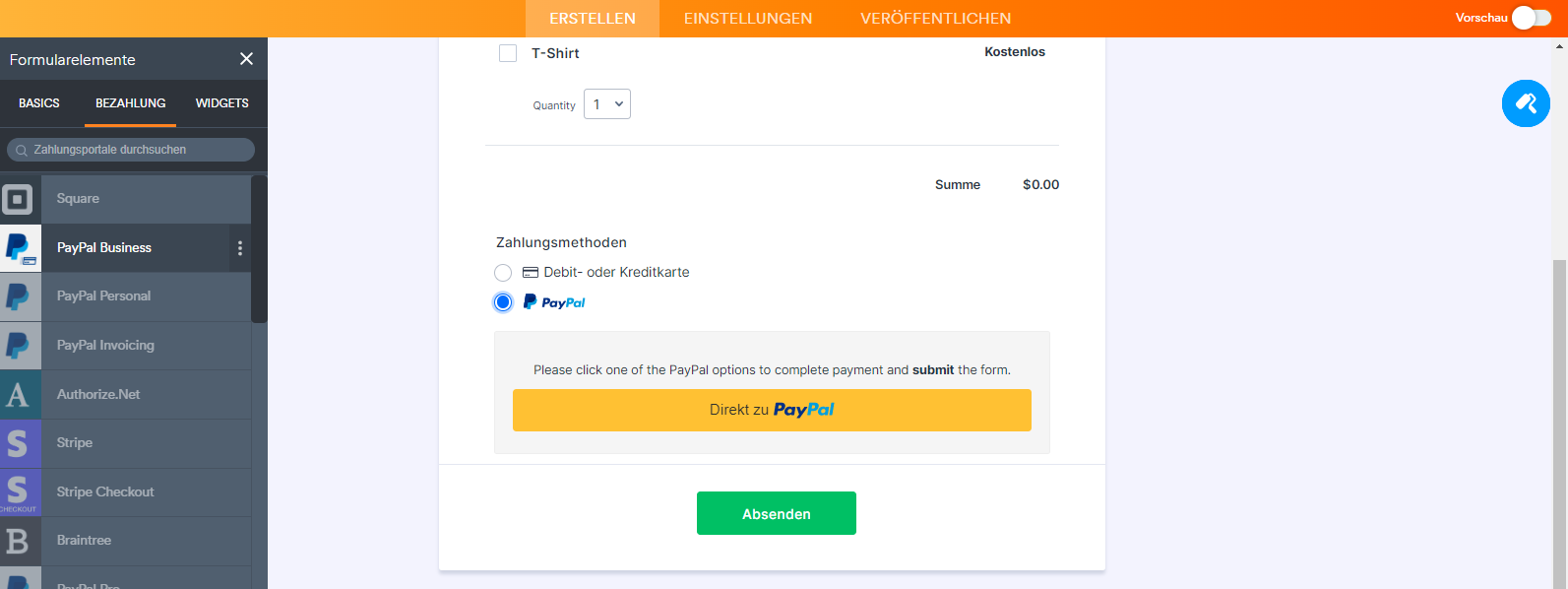 Einige Beispiele von verfügbaren Zahlungsintegrationen bei Jotform sind