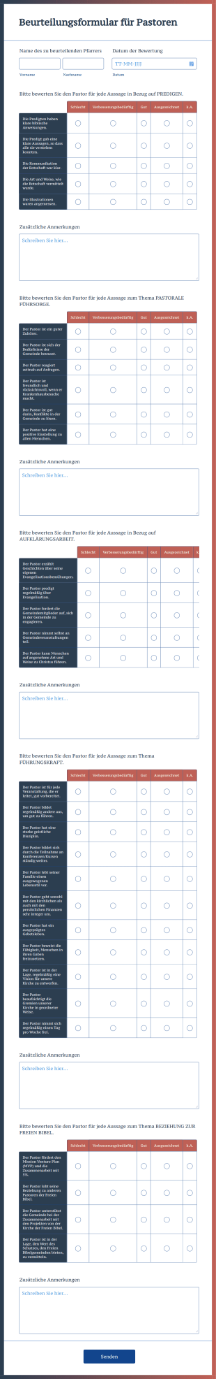 Ein Beurteilungsformular für Pastoren AI Agent ist ein interaktiver Assistent, der Gemeinden dabei hilft, Rückmeldungen zu Pastoren zu sammeln und deren Leistungen zu bewerten. Dieser AI Agent ermöglicht es den Mitgliedern, ihre Meinungen und Erfahrungen durch eine benutzerfreundliche, gesprächsorientierte Schnittstelle zu teilen, wodurch eine wertvolle Datenbasis für die Kirchenleitung entsteht.