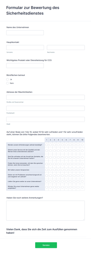 Unternehmen im Sicherheitssektor, Sicherheitsdienstleister und Manager, die die Qualität ihrer Dienstleistungen verbessern möchten, können von dieser Vorlage profitieren. Diese Vorlage ist auch nützlich für Organisationen, die regelmäßig Feedback einholen müssen, um ihre Dienstleistungen zu optimieren. Wichtige Benutzer sind: