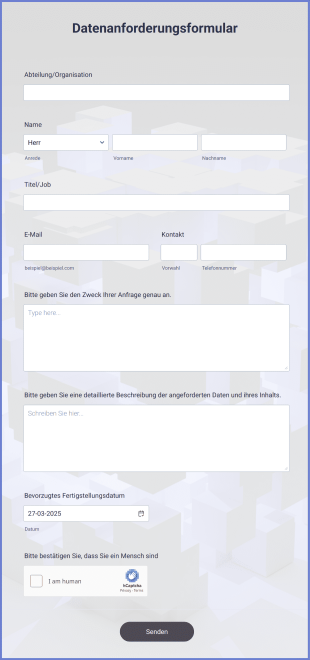 Ein Datenanforderungs-AI-Agent ist ein interaktiver Assistent, der Unternehmen unterstützt, indem er Datenanfragen über eine benutzerfreundliche, dialogbasierte Schnittstelle verarbeitet. Dieser AI-Agent ermöglicht es Unternehmen, relevante Informationen von ihren Kunden zu sammeln, um die Bearbeitung von Anfragen zu optimieren und die Kommunikation zu verbessern.