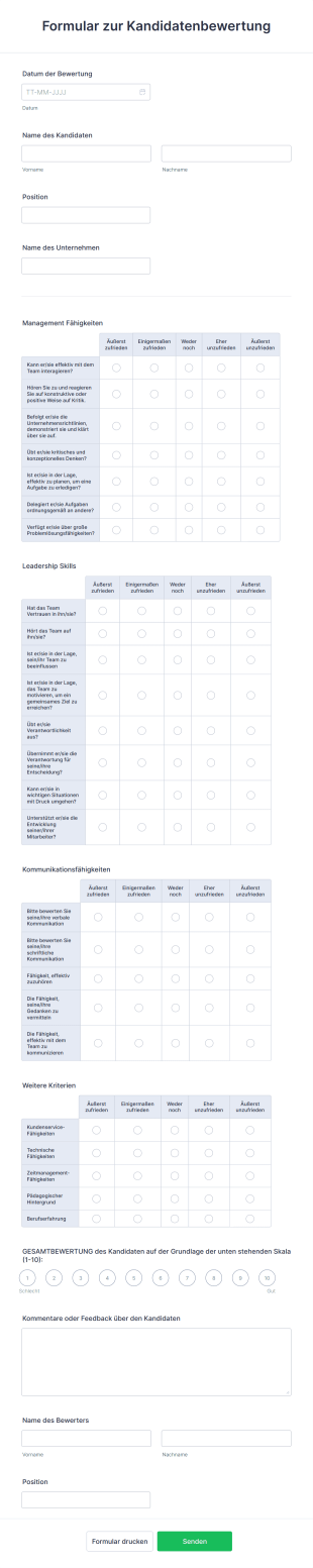 Der Kandidatenbewertung AI Agent erfasst Daten über den Kandidaten, einschließlich Name, Position, Managementfähigkeiten und Kommunikationsfähigkeiten. Er ermöglicht die Bewertung der Kandidaten auf einer Skala von 1 bis 10 und die Erfassung von Kommentaren oder Feedback über die Kandidaten. Diese Informationen werden in einem strukturierten Format gesammelt, das die Auswertung und Analyse erleichtert. Jotform bietet zudem Anpassungsoptionen, um den Agenten an die spezifischen Bedürfnisse des Unternehmens anzupassen.