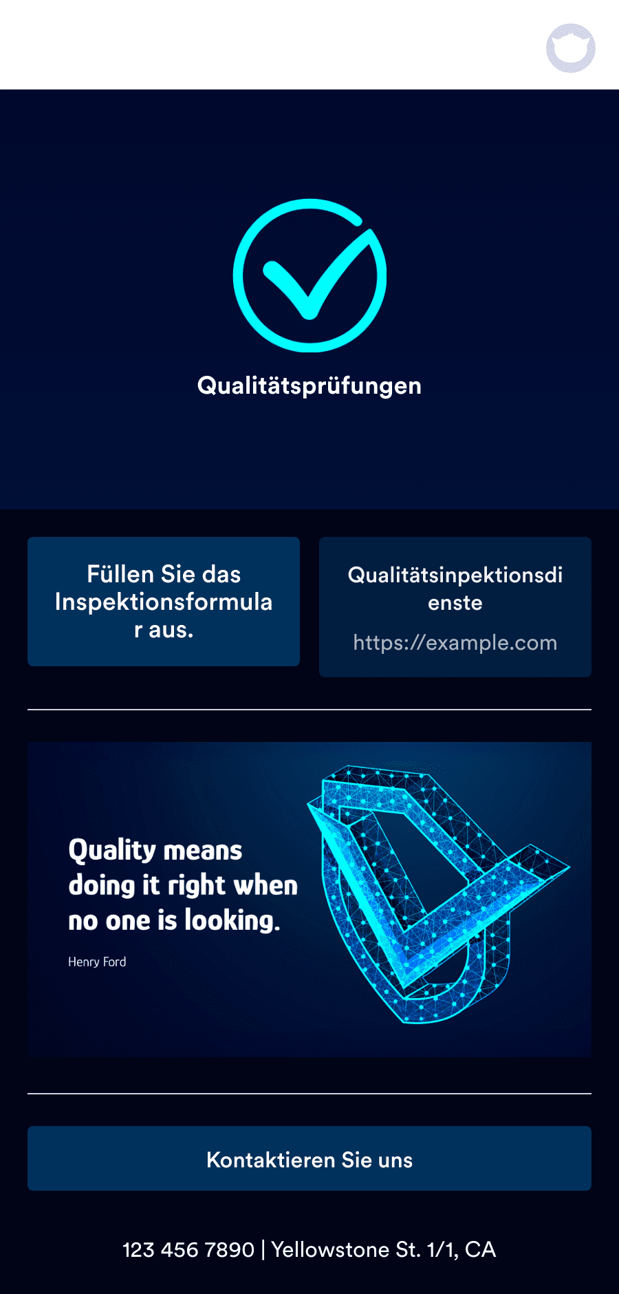 Möchten Sie diese mobile Inspektions-App an Ihre Bedürfnisse anpassen? Kein Problem – ganz ohne Programmierung können Sie Formulare hinzufügen, Links zu Tabellen oder anderen Websites einbetten, den bereitgestellten Text aktualisieren, Bilder oder Logos hochladen und App-Einstellungen wie Name, Symbol und Startseite ändern, um Ihr Inspektionsunternehmen optimal zu präsentieren. Sobald die App einsatzbereit ist, laden Sie sie auf Ihr Mobilgerät oder Ihren Desktop-Computer herunter, um jederzeit bequem darauf zugreifen zu können. Erleichtern Sie sich zukünftige Inspektionen mit einer effizienten mobilen Inspektions-App, die überall funktioniert.