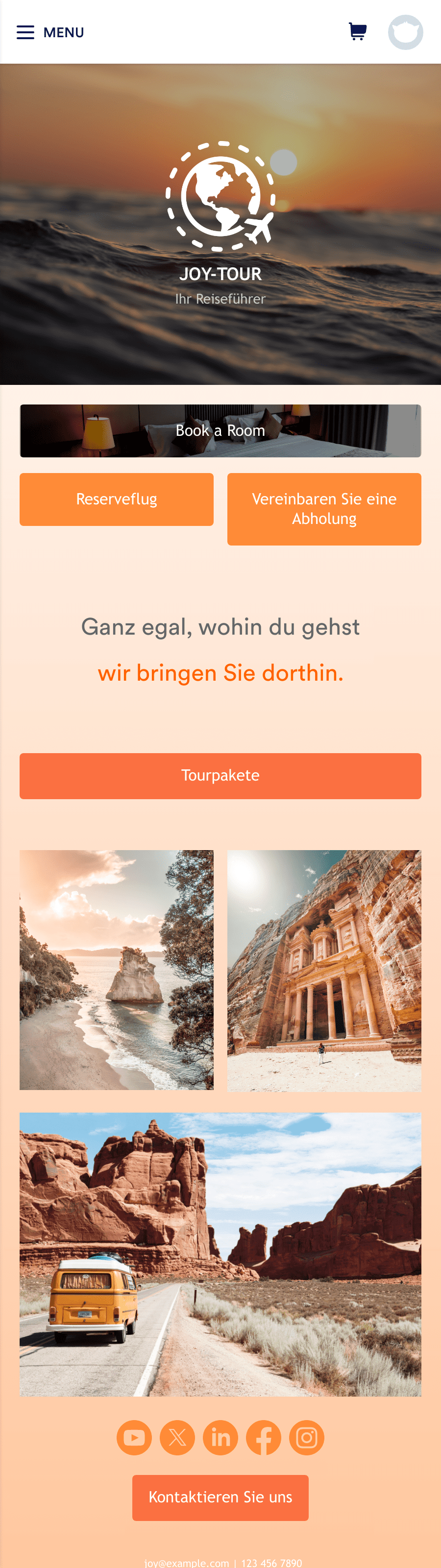 Möchten Sie diese App-Vorlage an das Branding Ihres Reisebüros anpassen? Kein Problem! Programmierkenntnisse sind nicht erforderlich. Nutzen Sie einfach unseren Drag-and-drop-Formulargenerator, um Formularelemente hinzuzufügen oder auszutauschen, Schriftarten und Farben auszuwählen, Ihr Logo hochzuladen und vieles mehr. Sie können Ihren Startbildschirm und die einzelnen Formularseiten auch mit Fotos von Hotelzimmern und Reisezielen bereichern. Anschließend können Sie Ihre App per Link teilen oder in Ihre Website einbetten. Ihre Kunden können sie dann auf jedem Smartphone, Tablet oder Desktop-Computer herunterladen. Machen Sie die Reiseplanung zum Kinderspiel und verkaufen Sie Reisepakete online mit dieser fertigen Reise-App von Jotform.