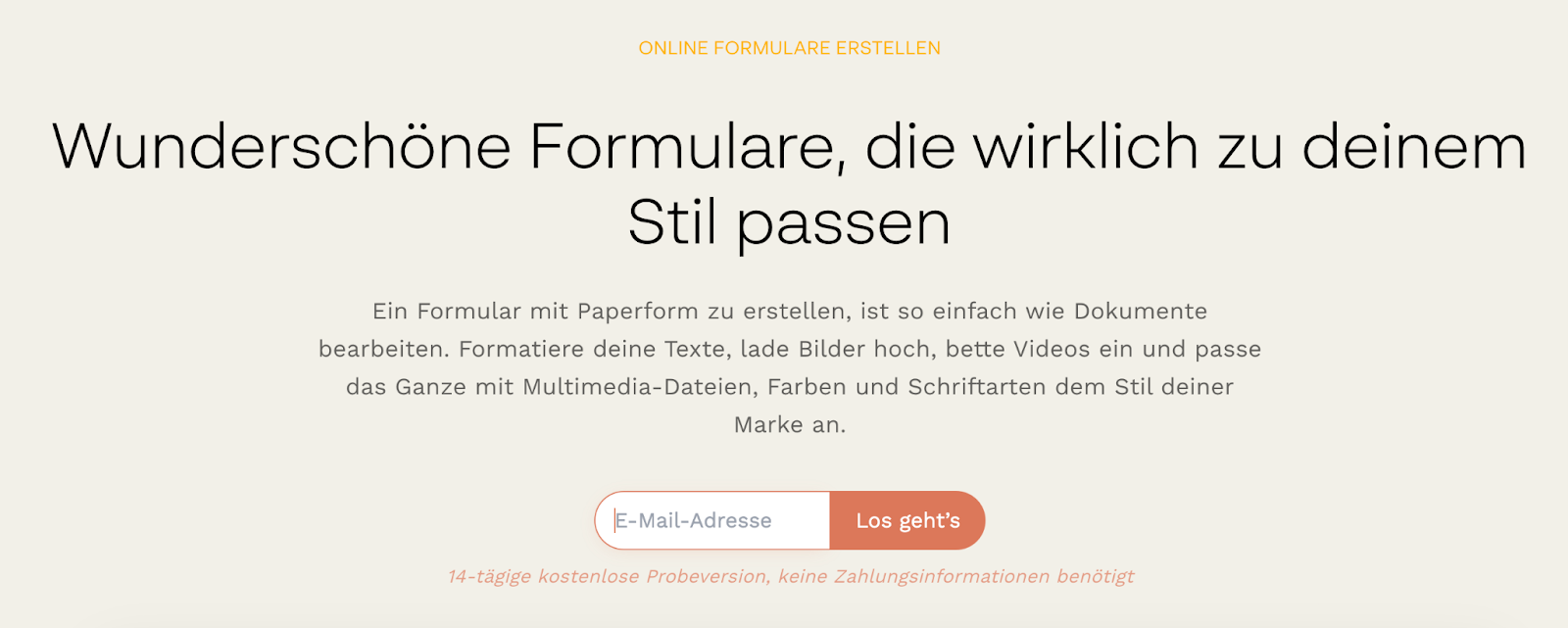 Paperform ermöglicht es Ihnen, dank der benutzerfreundlichen Oberfläche und Hunderten von Vorlagen, visuell beeindruckende Formulare zu erstellen. Sie können jedem Formular bedingte Logik, elektronische Zahlungen, automatische Berechnungen, Sofortbenachrichtigungen und vieles mehr hinzufügen.
