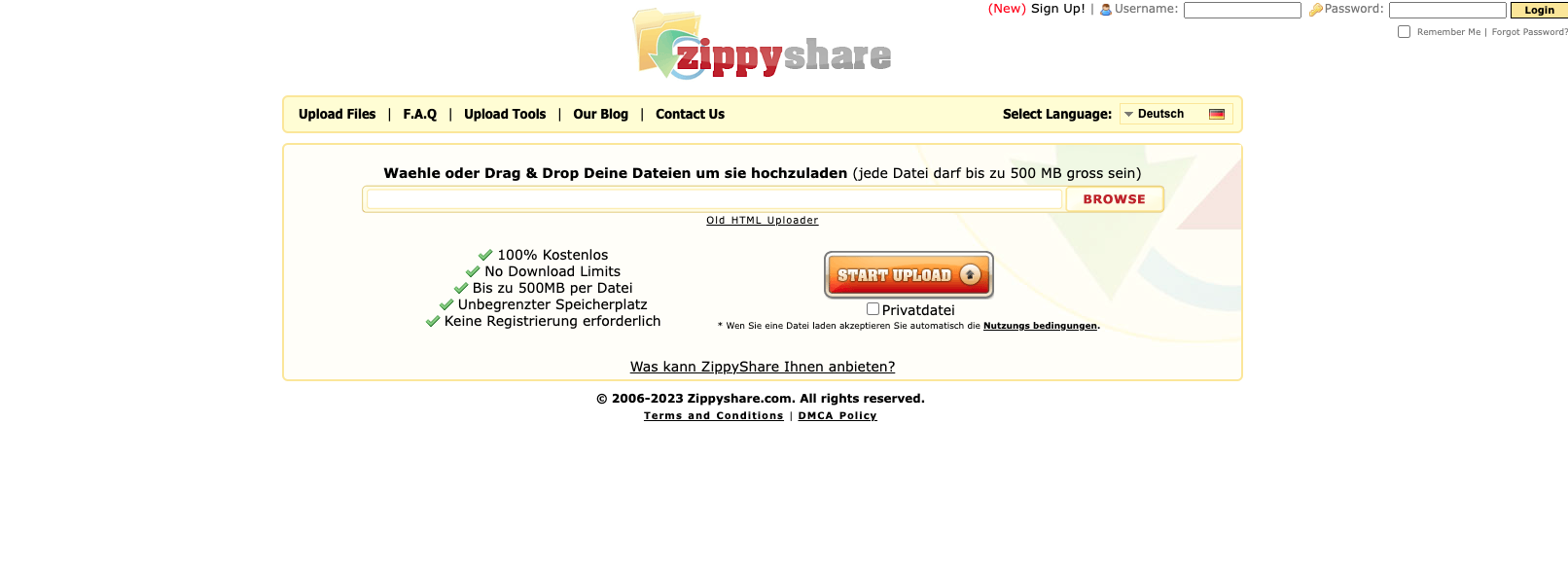 Wenn Sie auf der Suche nach einer einfachen Website für den Dateiaustausch sind, die völlig kostenlos ist und bei der Sie sich nicht anmelden müssen, sind Sie bei Zippyshare für Dateien bis zu 500 MB genau richtig. Hier gibt es keine Download-Limits, aber Ihre Datei wird nach 30 Tagen ohne Aktivität gelöscht. Sobald Sie Ihre Datei hochgeladen haben, erhalten Sie einen eindeutigen Link, den Sie mit anderen teilen oder zu einem Blog oder einer Webseite hinzufügen können.