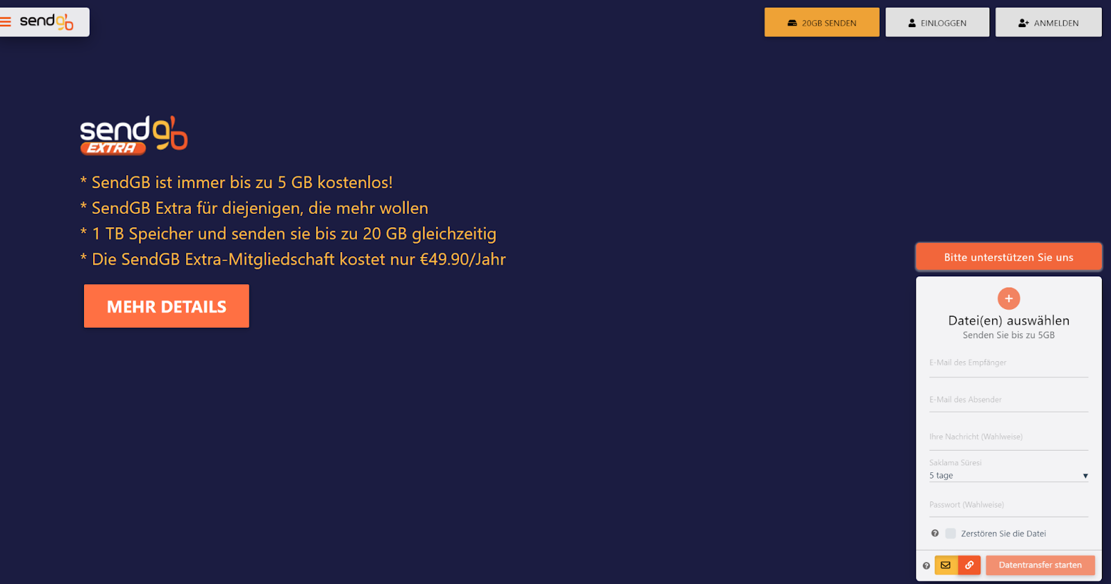 SendGB ist eine weitere praktische kostenlose Alternative für den Versand von Dateien unter 5 GB. Diese Lösung bietet einen einfachen Uploader mit der Option, die Datei per E-Mail oder Link mit einer anpassbaren Nachricht und optionalem Passwortschutz zu versenden.