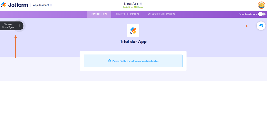- Sie werden zum App Generator von Jotform weitergeleitet. Hier können Sie App-Elemente hinzufügen, das Design anpassen und Einstellungen vornehmen. Um ein neues App-Element hinzuzufügen, klicken Sie auf Element hinzufügen. Um das Design anzupassen, klicken Sie auf das Symbol des Farbrollers. Sie können App-Elemente ziehen und ablegen, um sie neu anzuordnen.